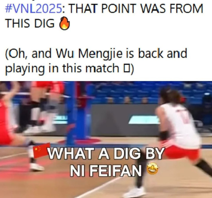 而在防守端,自由人倪非凡则以一记飞身救球赢得全场惊叹,国际排联还特别剪辑该球并配文:“THAT POINT WAS FROM THIS DIG!”,吴梦洁的精彩得分起始于倪非凡的这次神级防守,成为全场转折点。