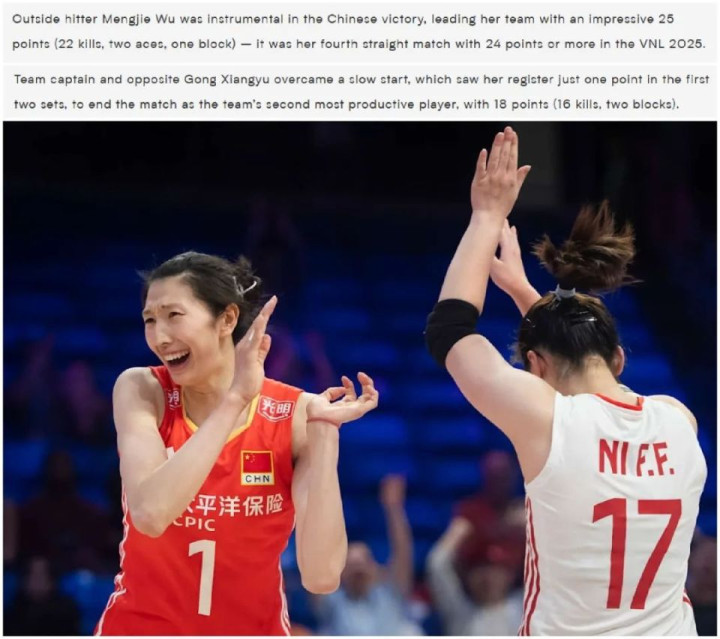 本场比赛中,主攻吴梦洁再度成为全队得分王,拿下 25分(22次扣球得分+2个发球得分+1个拦网),这是她连续第四场比赛得分超过24分,国际排联盛赞道:“吴梦洁本场比赛发挥关键作用,是中国女排取胜的重要人物。”
